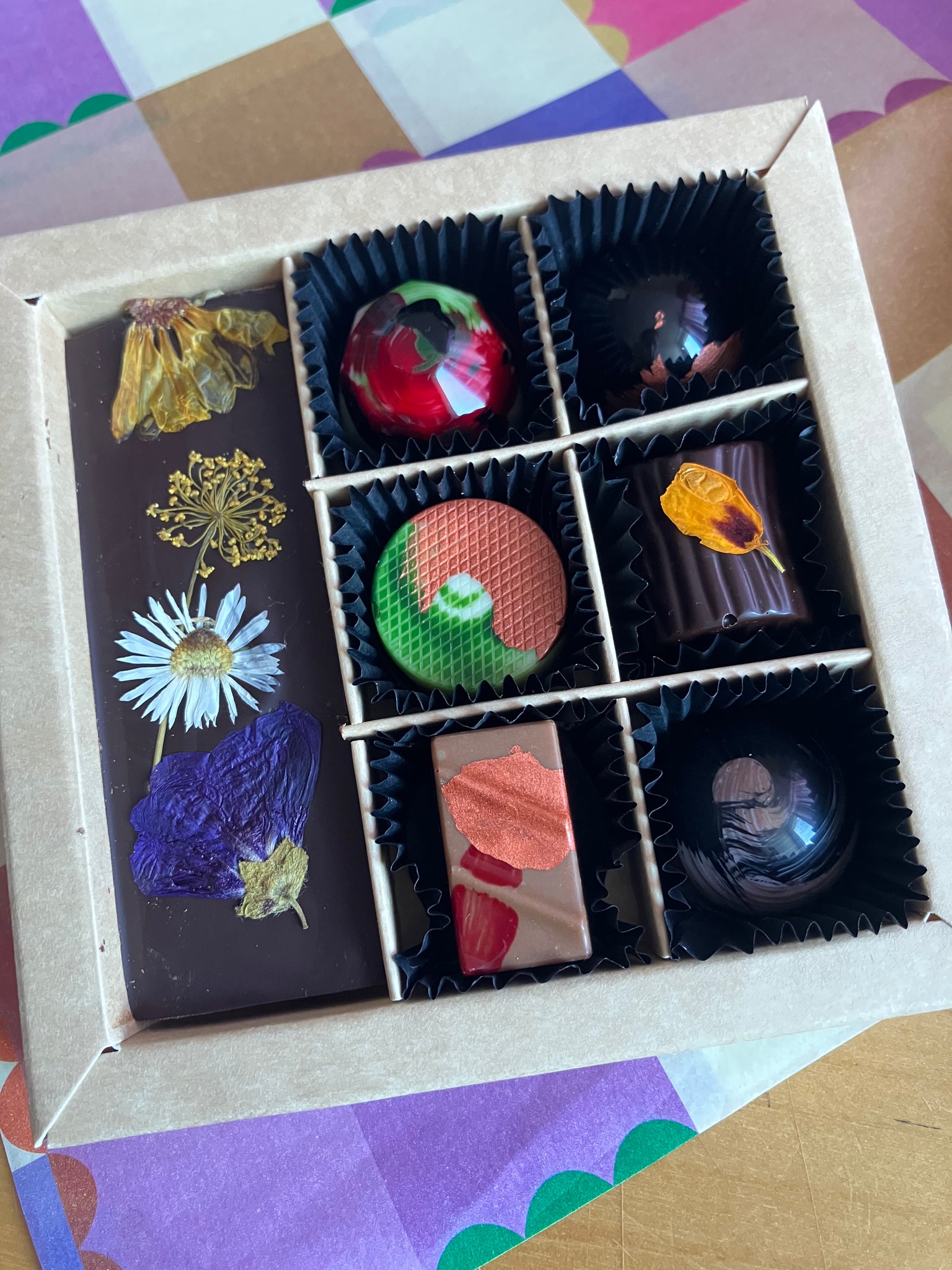 Een klein bloemenreepje en 6 handbeschilderde bonbons.