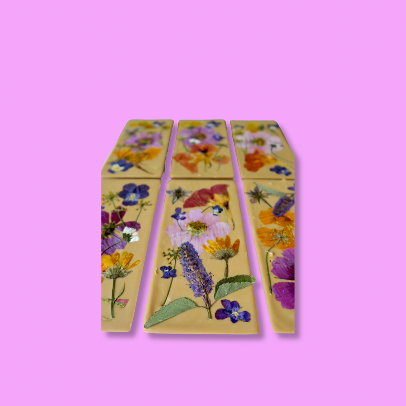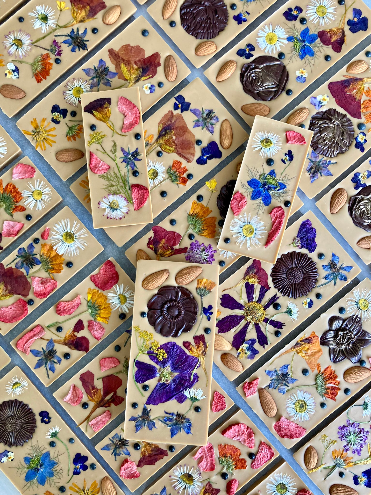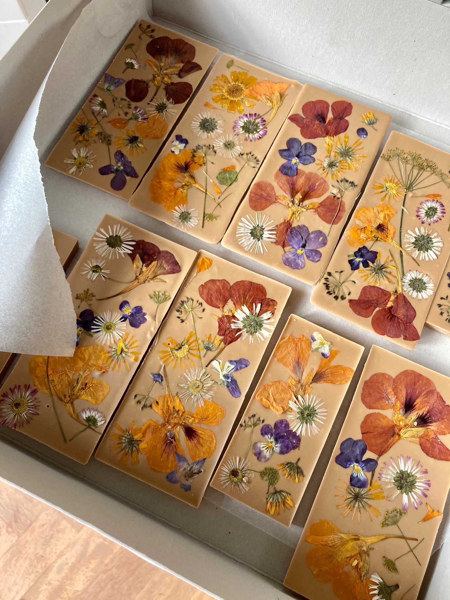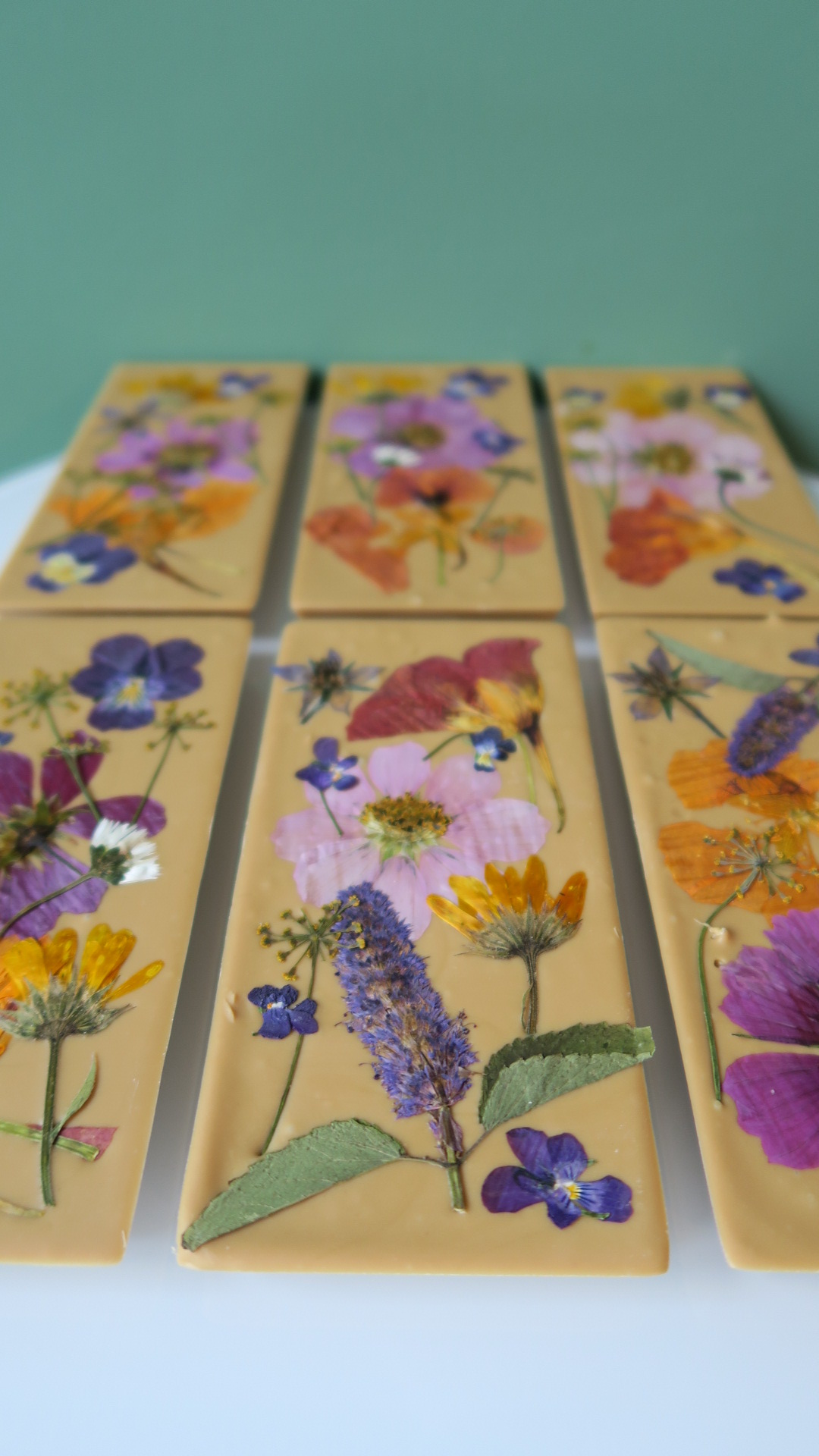 Belgische gecaramelliseerde witte chocolade belegd met handgeplukte eetbare biologische bloemen uit Haarlem.
