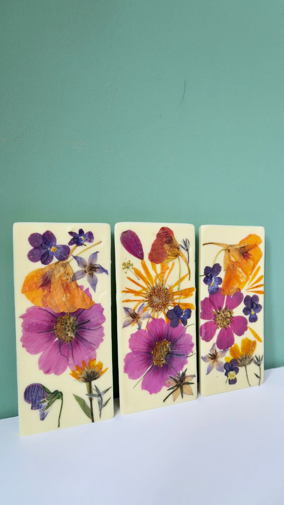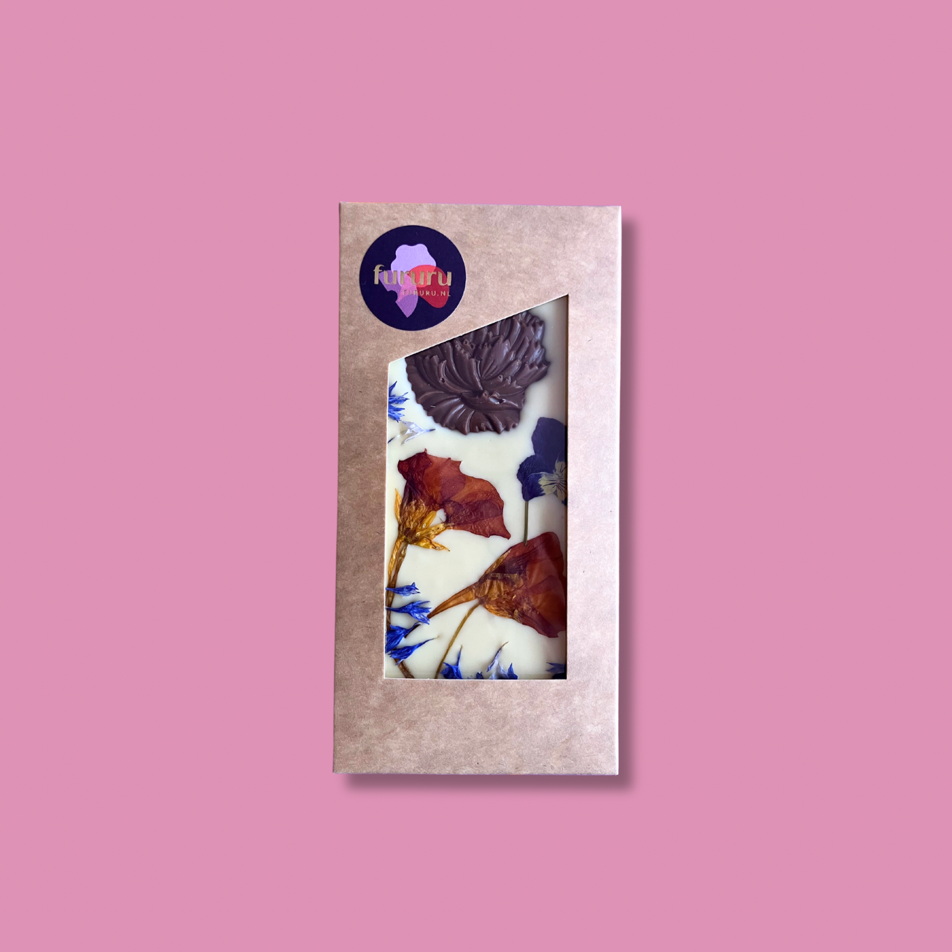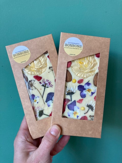 Witte Belgische chocolade belegd met eetbare biologische bloemen.