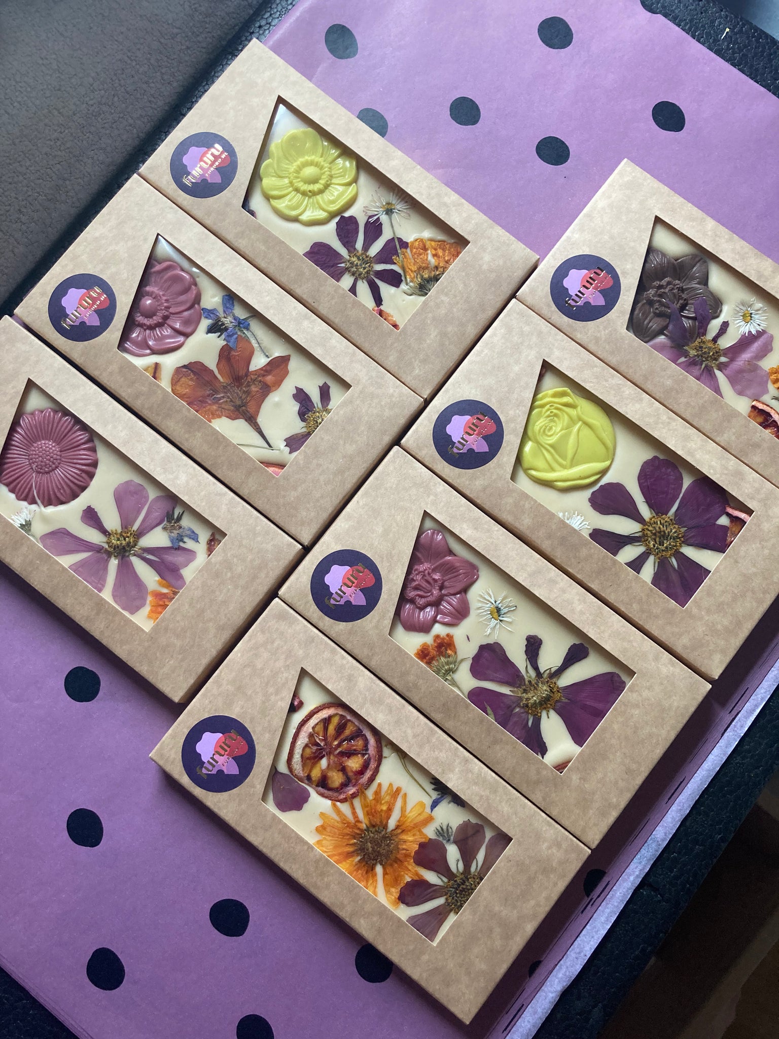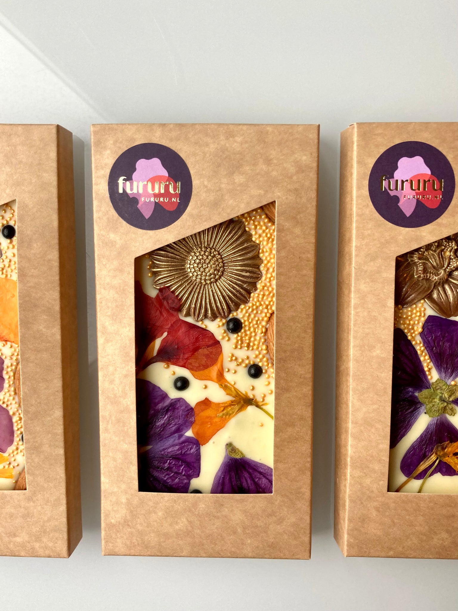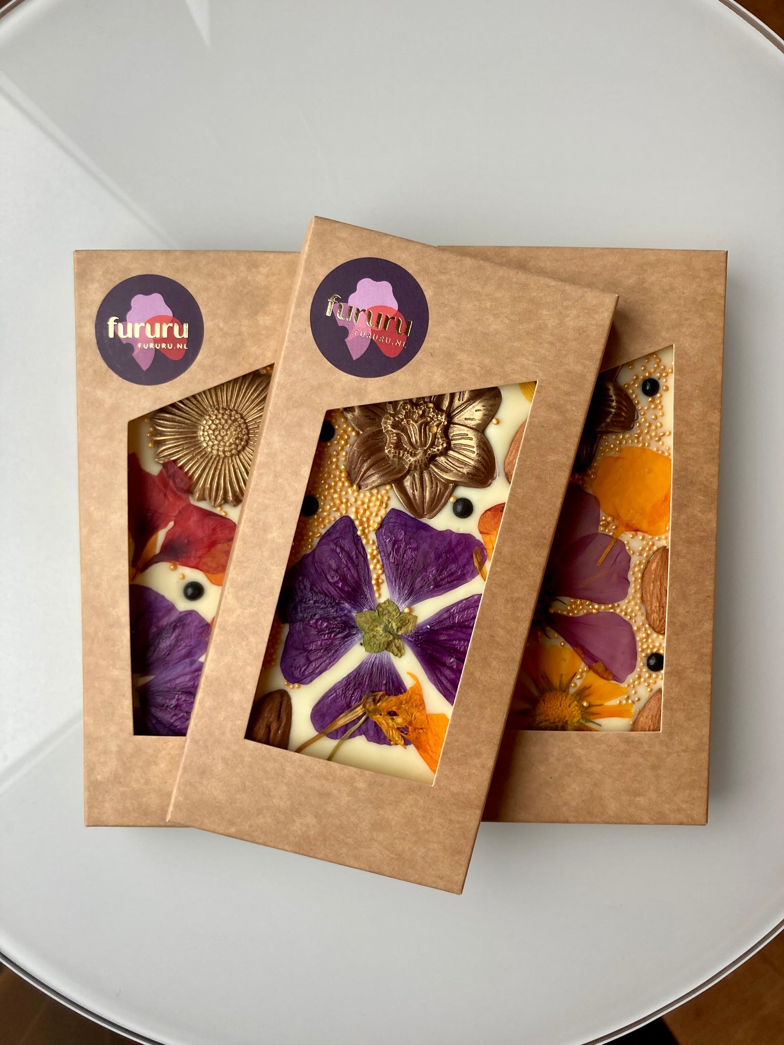 Witte Belgische chocolade belegd met eetbare biologische bloemen.