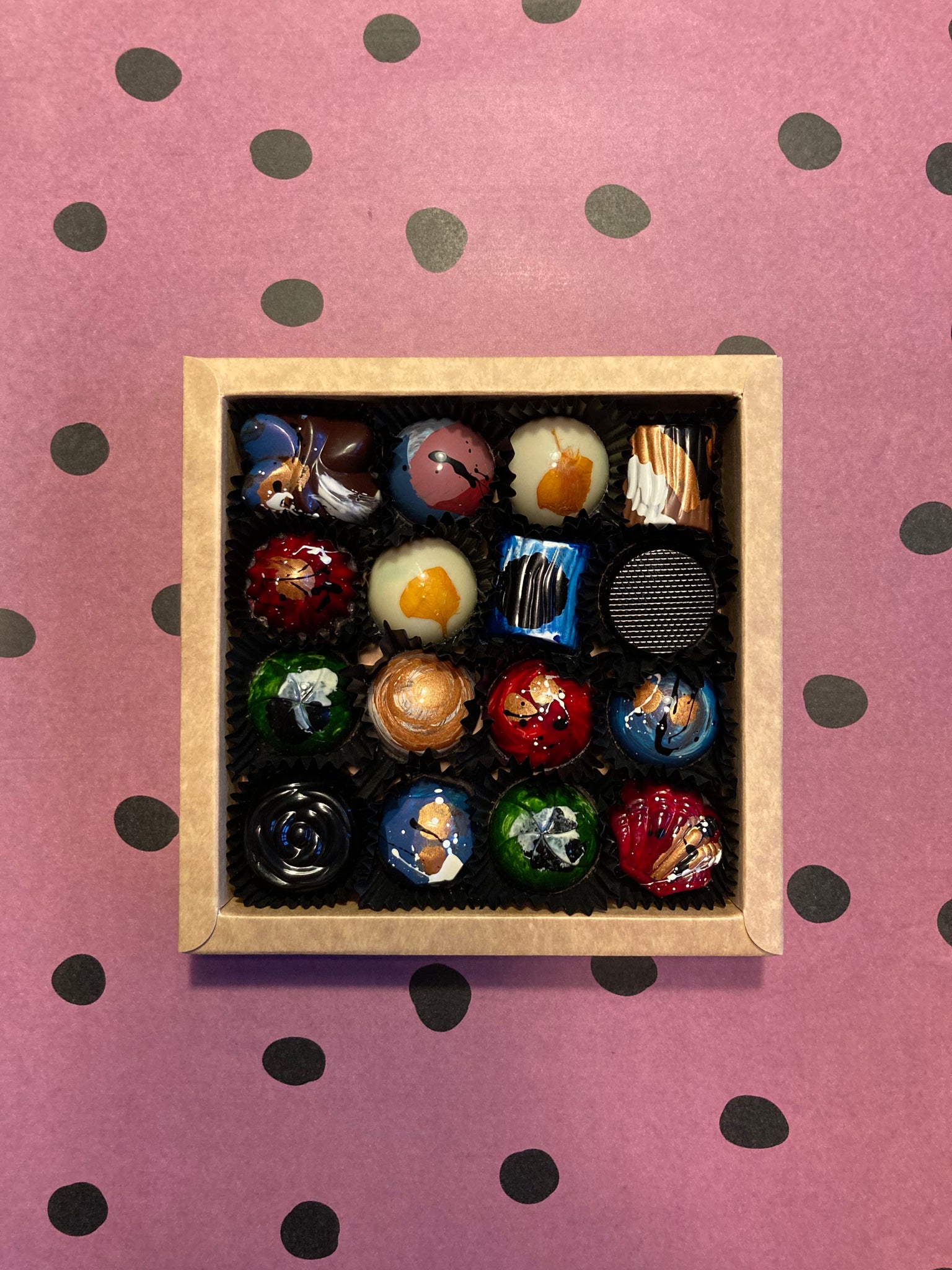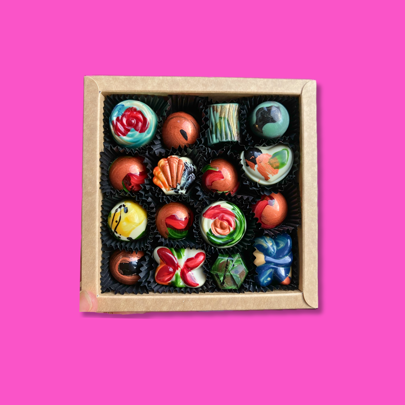 16 Handgemaakte bonbons met verrassende smaken.