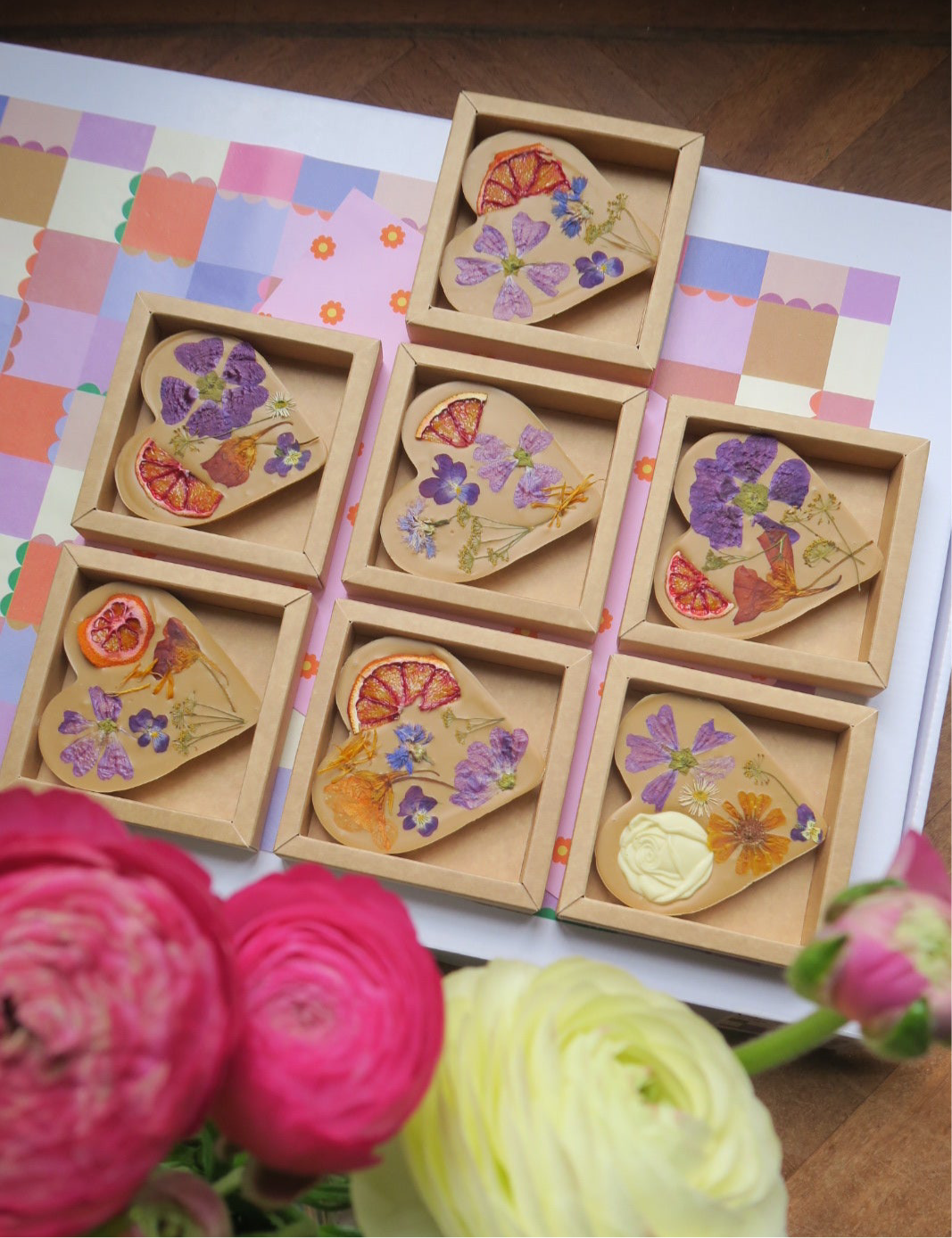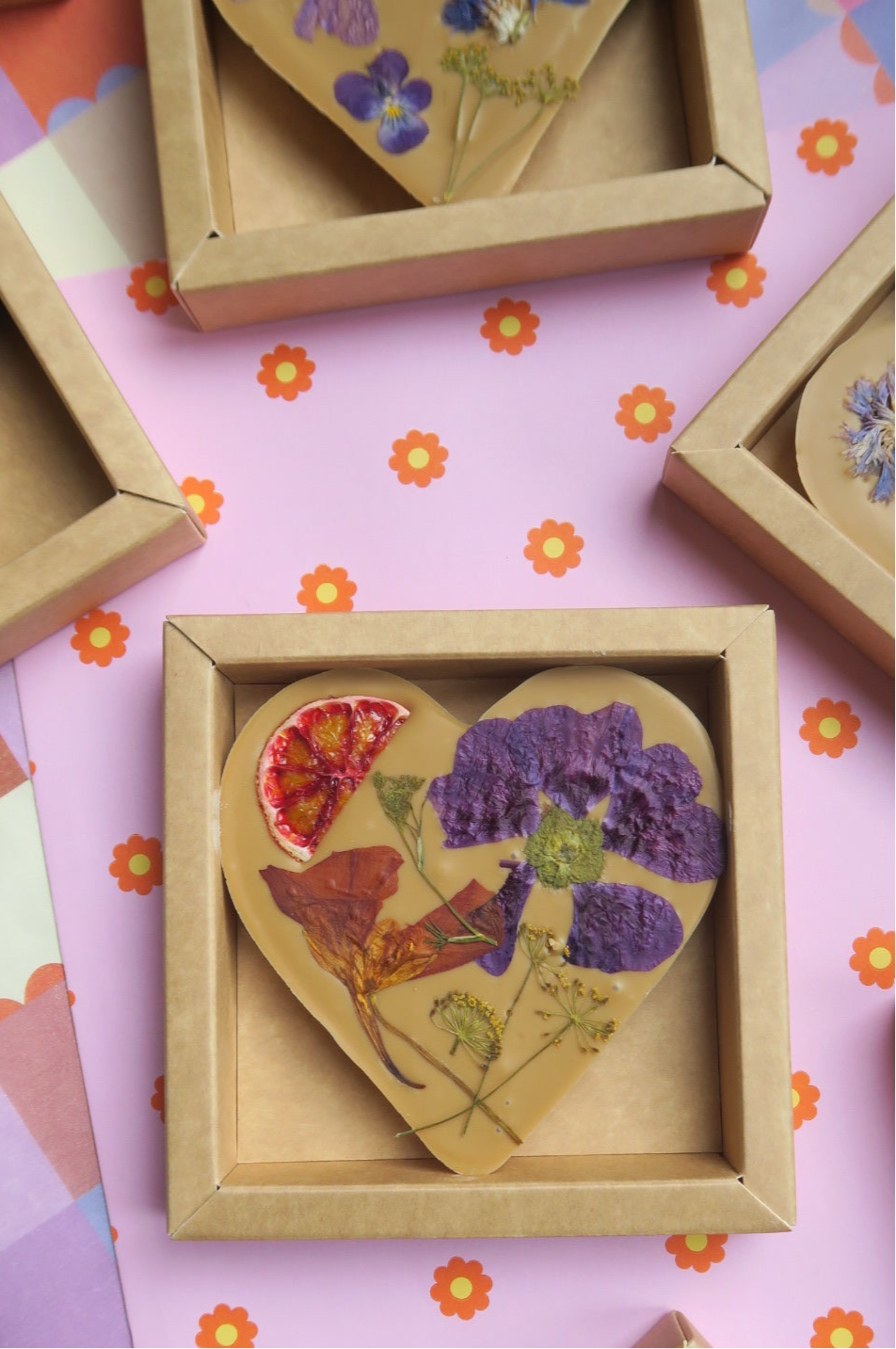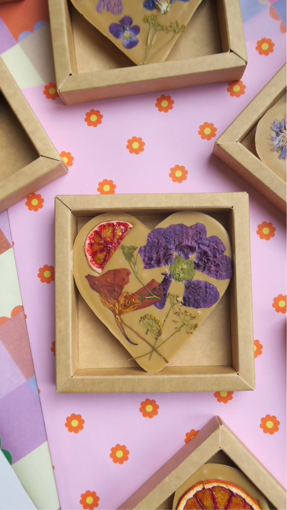 Een hart van Belgische gecaramelliseerde chocolade met handgeplukte eetbare biologische bloemen. In cadeauverpakking.