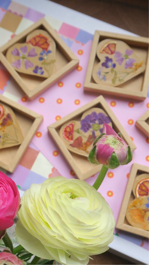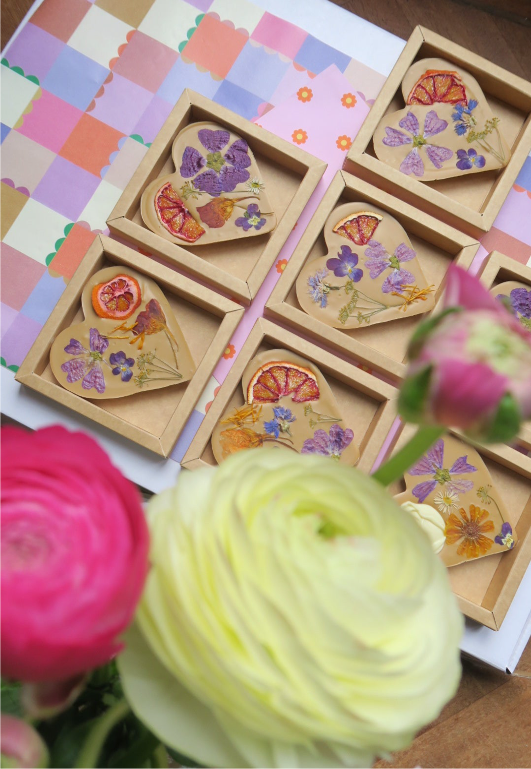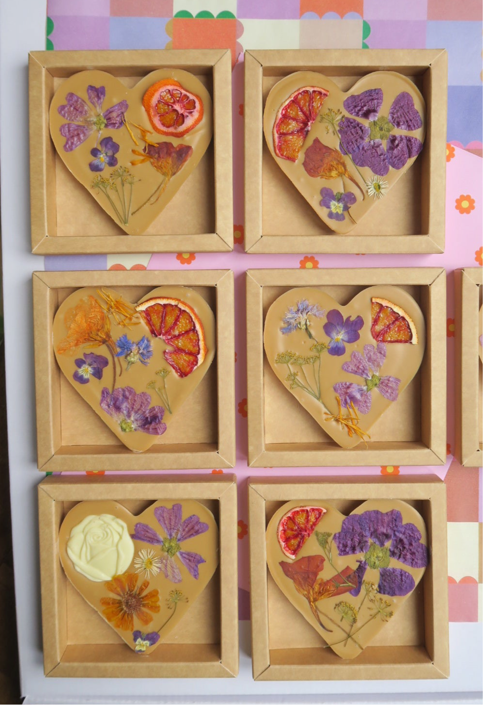 Een hart van Belgische gecaramelliseerde chocolade met handgeplukte eetbare biologische bloemen. In cadeauverpakking.