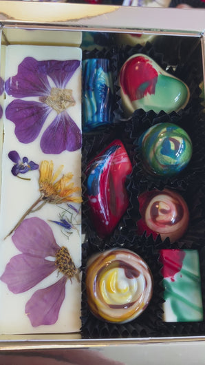 Gecombineerd met handbeschilderde ambachtelijke bonbons met verrassende vullingen.