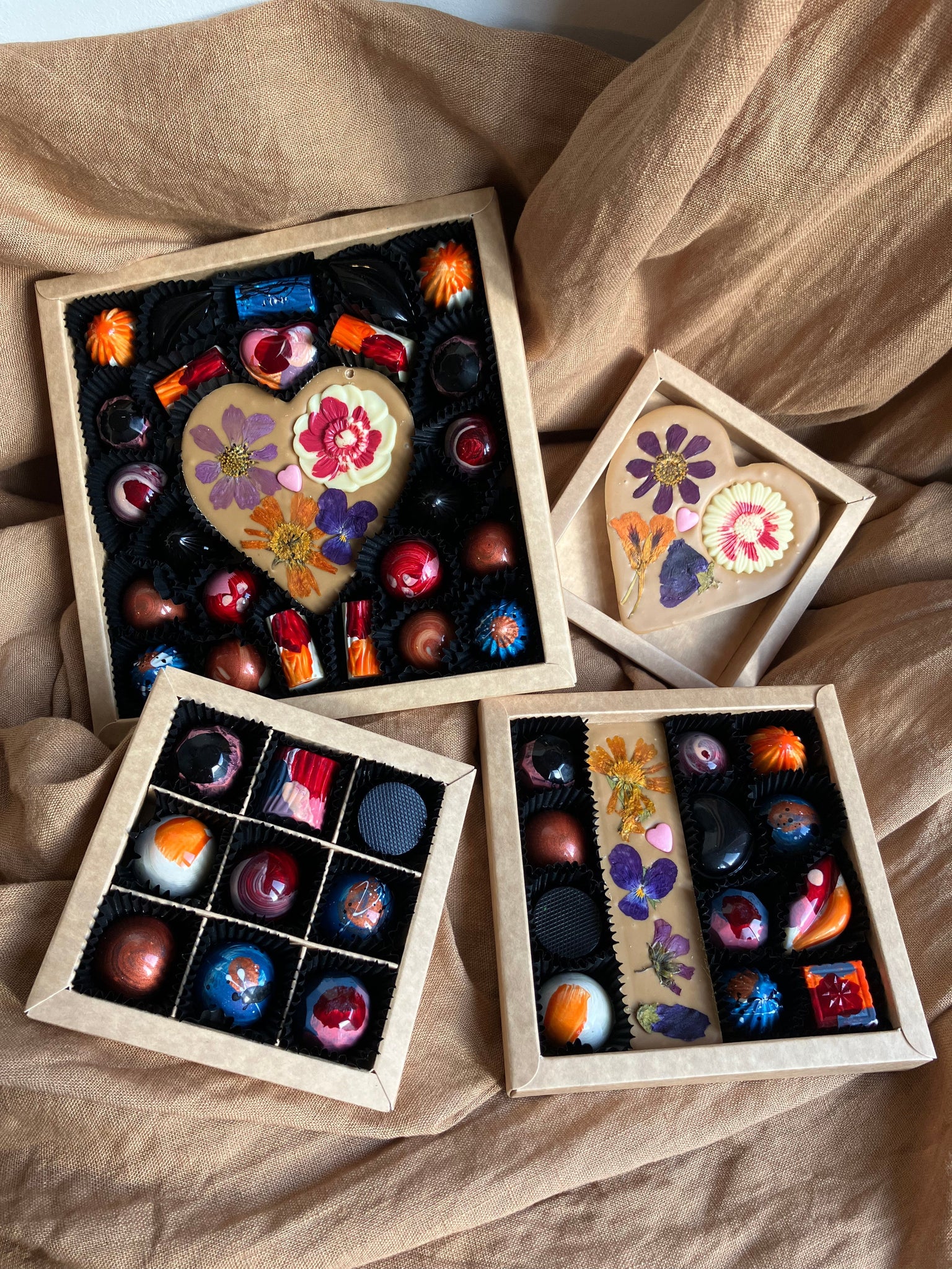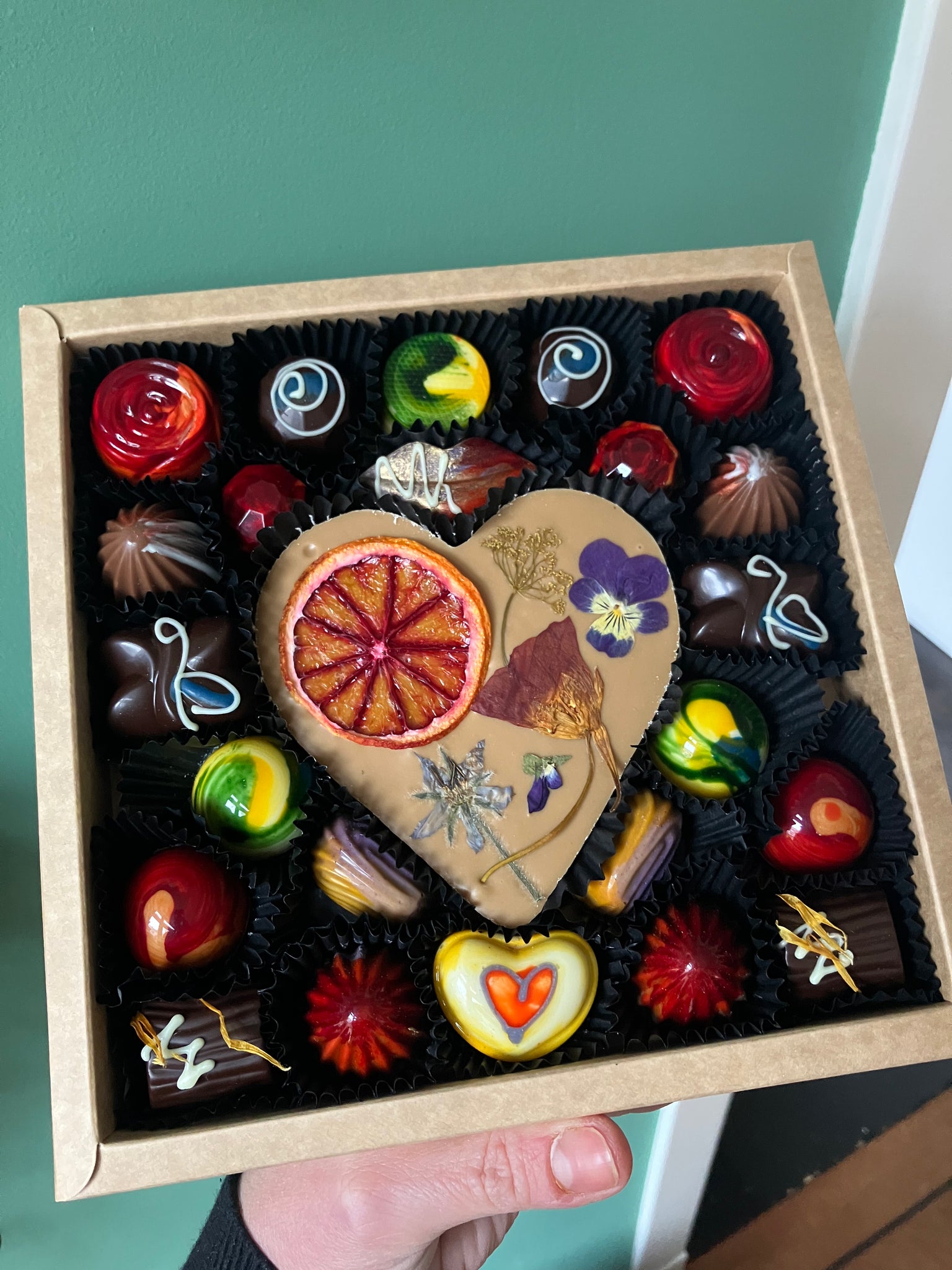 Handgemaakte bonbons plus een bloemenhart. Informeer gerust naar wat er op voorraad is :-)